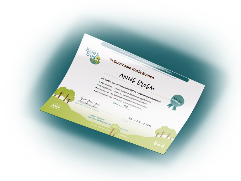 Bij Boes Bos zijn we ANBI-gecertificeerd (ja, dat betekent belastingvoordeel). Maar belangrijker: jouw geld gaat naar bomen, niet naar glimmende kantoorpanden of strakke pakken.